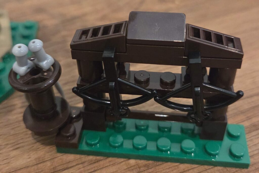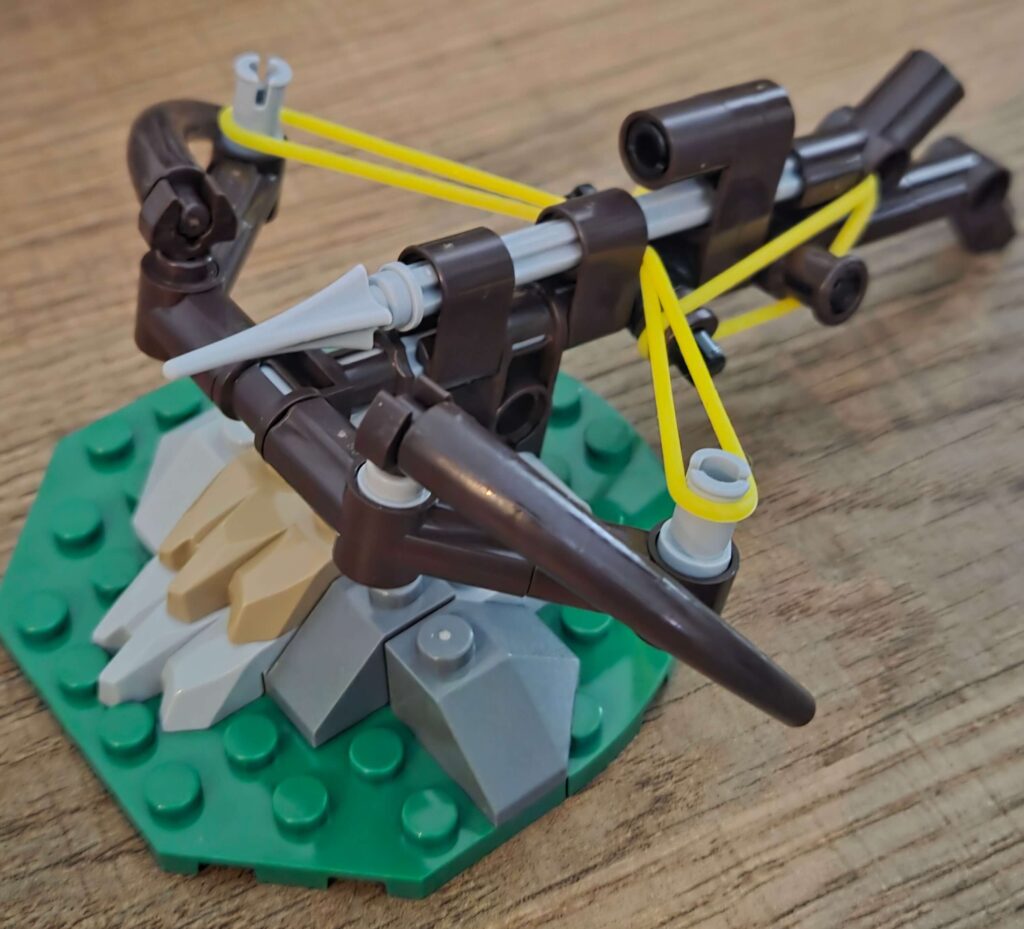 The instructions introduce elastic bands, which immediately suggests this is more than just a static display piece. And sure enough, the ballista actually fires. Pull back the mechanism, release it, and the arrow shoots forward with surprising force.