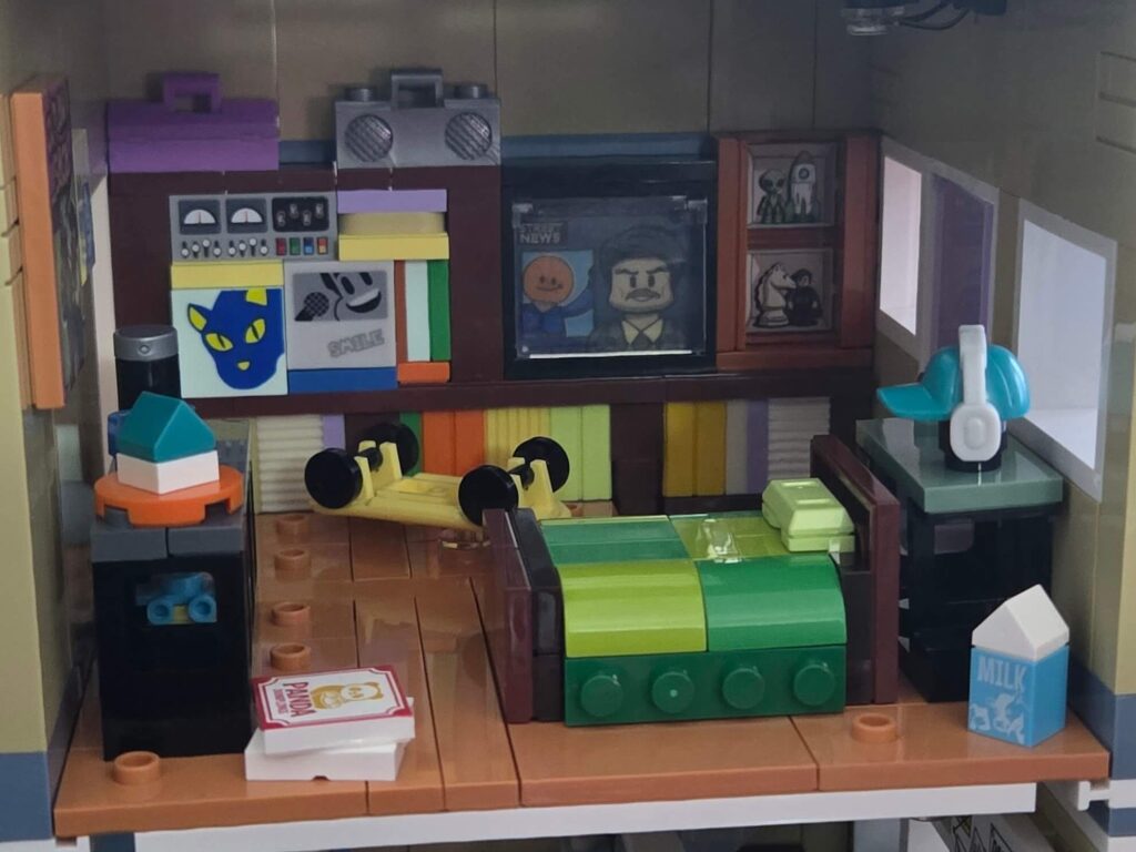 The tenant is also clearly a massive music and gaming fan. On the main shelves, you build a classic grey boombox sitting above a highly detailed amplifier unit with printed dials and sliders. Below that, there are some fantastic printed record sleeves, including a funky blue cat face and a “SMILE” microphone cover. Alongside a blue gaming controller resting on the TV stand, there are also some brilliant little geeky display shelves built into the wall featuring a tiny alien with a rocket ship and an oversized chess knight.