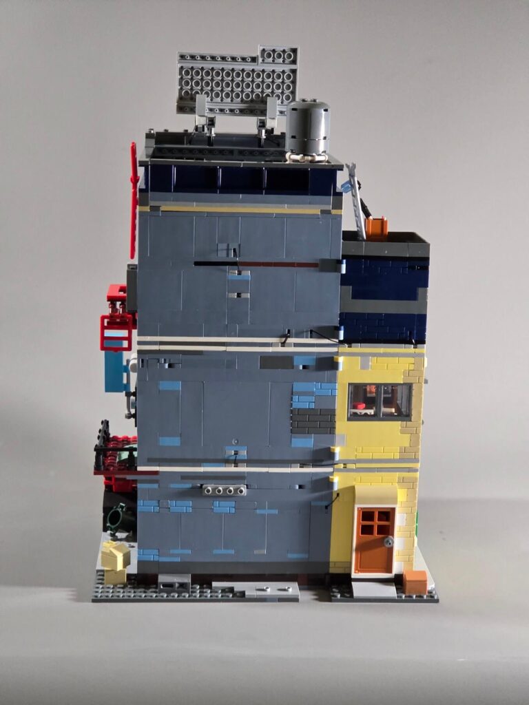 Moving up to that first-floor balcony on the left side, there is a little outdoor space. It features a small table holding a yellow mug and a printed “AGREEMENT” document, alongside a random loose car tyre (maybe used as a chair), which really adds to that slightly cluttered urban feel. Just above the balcony doorway sits a curved roof section made from metallic silver pieces, not just standard flat grey plastic. While I always appreciate getting these premium metallic parts, I have to be honest: I am not entirely sure the bright silver actually goes with the overall colour scheme of the build. I think a different colour might have worked much better here to tie the facade together.