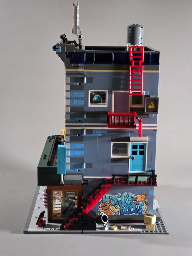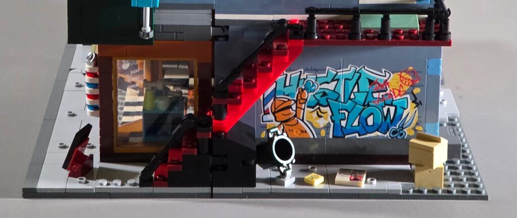 Down at street level, the bench features custom graffiti, perfectly matching the whole theme’s vibe. Honestly, it would not be a proper Street Fusion set without large graffiti tags plastered across the walls and doors. They even went as far as tagging the electrical warning cabinet on the first-floor balcony! It is these nice little touches that they could have simply left out, but they don’t, and that is exactly the difference between Lumibricks and other brick companies.