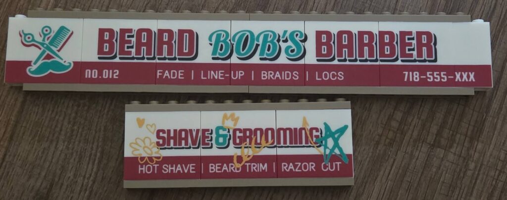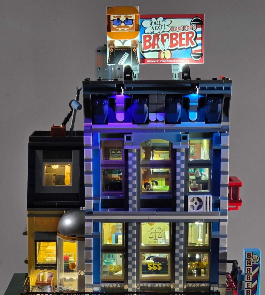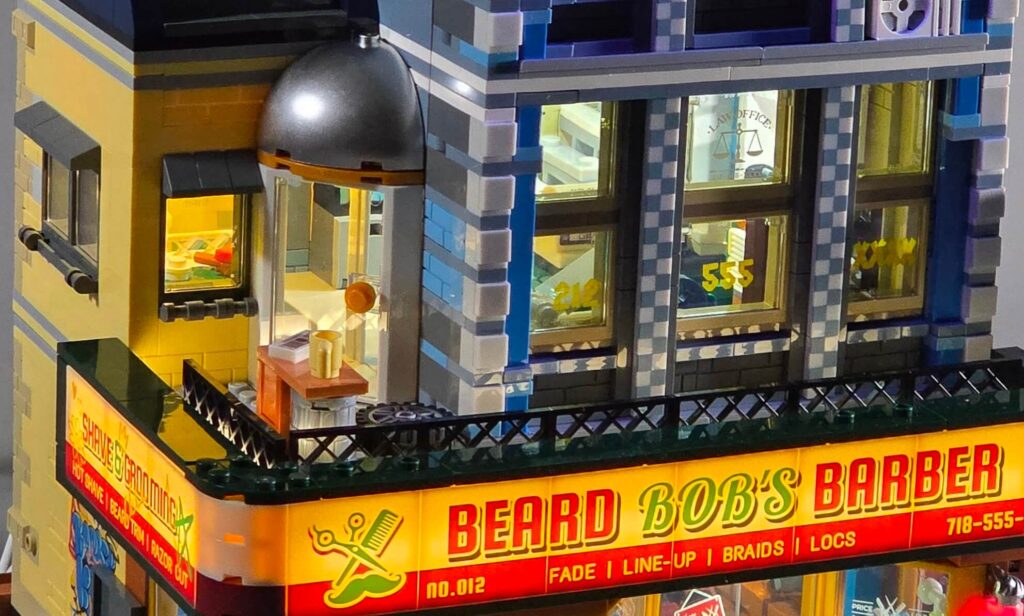 The building has real presence on a shelf. It stands incredibly tall, and I really love the main “Beard Bob’s Barber” sign. What makes the signage so impactful is that it is not just a flat board; it is a full wraparound sign that stretches entirely around the corner of the build to the left. It actually has lighting strips hidden behind it to light it up wonderfully at night, but we will get to that in the lighting section! You also get the iconic red, white, and blue barber pole out front, which looks great during the day and even better when illuminated.