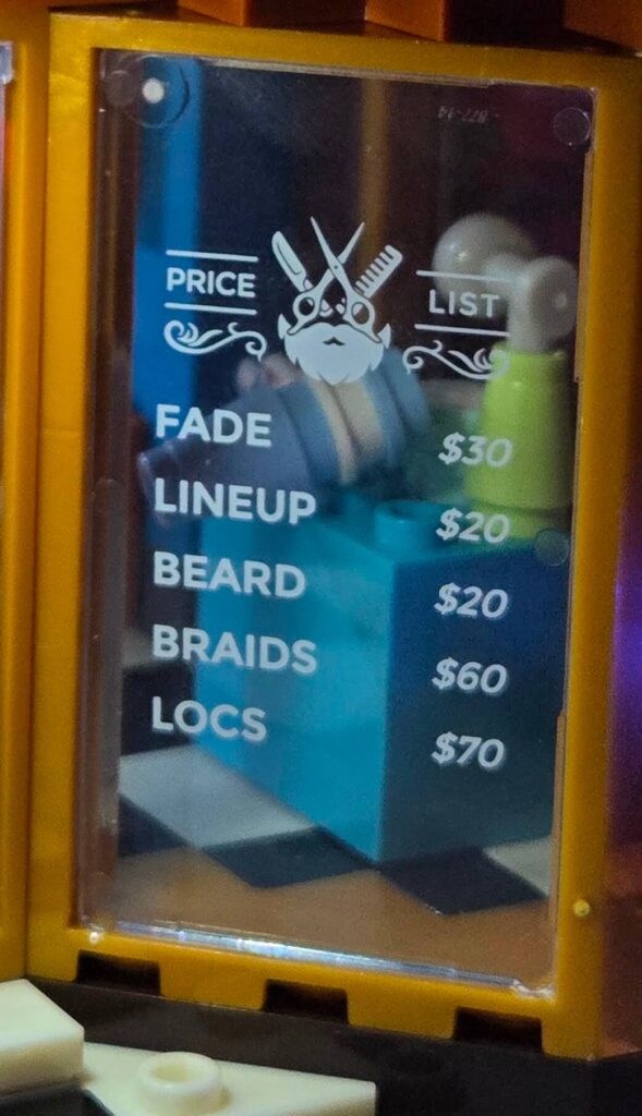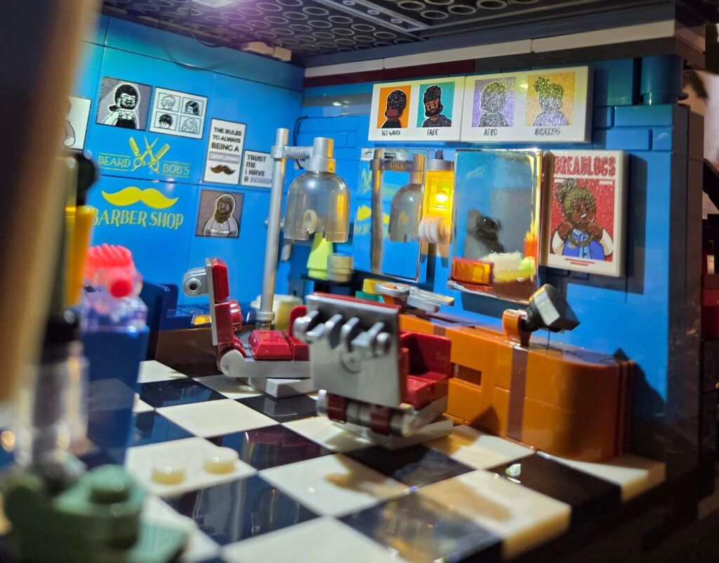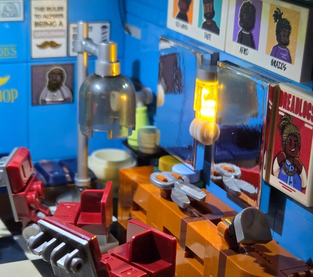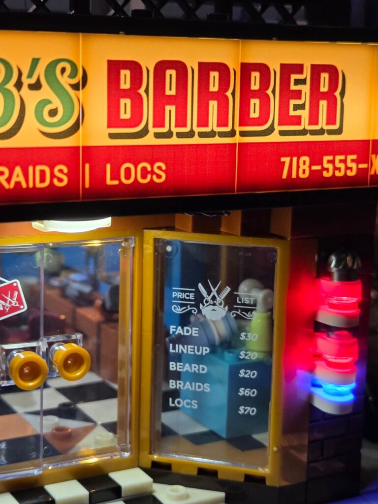 The atmosphere is absolutely spot on. It perfectly captures the gritty, vibrant vibe of a classic 1990s Brooklyn barbershop, specifically leaning into the rich culture of a classic barbershop in a Black American community. These shops are traditionally vital neighbourhood social hubs, and Lumibricks has clearly done their research to deliver an incredibly accurate and respectful rendition. You can see it in everything from the specific haircut styles featured on the posters, right down to the services listed on the front window: fades, line-ups, braids, and locs. While I am not from the US myself, I have watched more than enough movies from that era to recognise the cultural significance, and the design here is just fantastic.