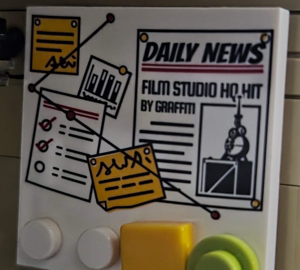 Scanning the walls, the attention to detail is superb. There is a highly detailed printed noticeboard featuring a “Daily News” clipping about a film studio getting hit by graffiti, which is a brilliant little Easter egg connecting this building to the wider Street Fusion universe (Is this a teaser for a future Film Studio set?). You will also spot a great framed photo on the wall showing the lawyer and the barber together, adding a lovely touch of shared neighbourhood history.