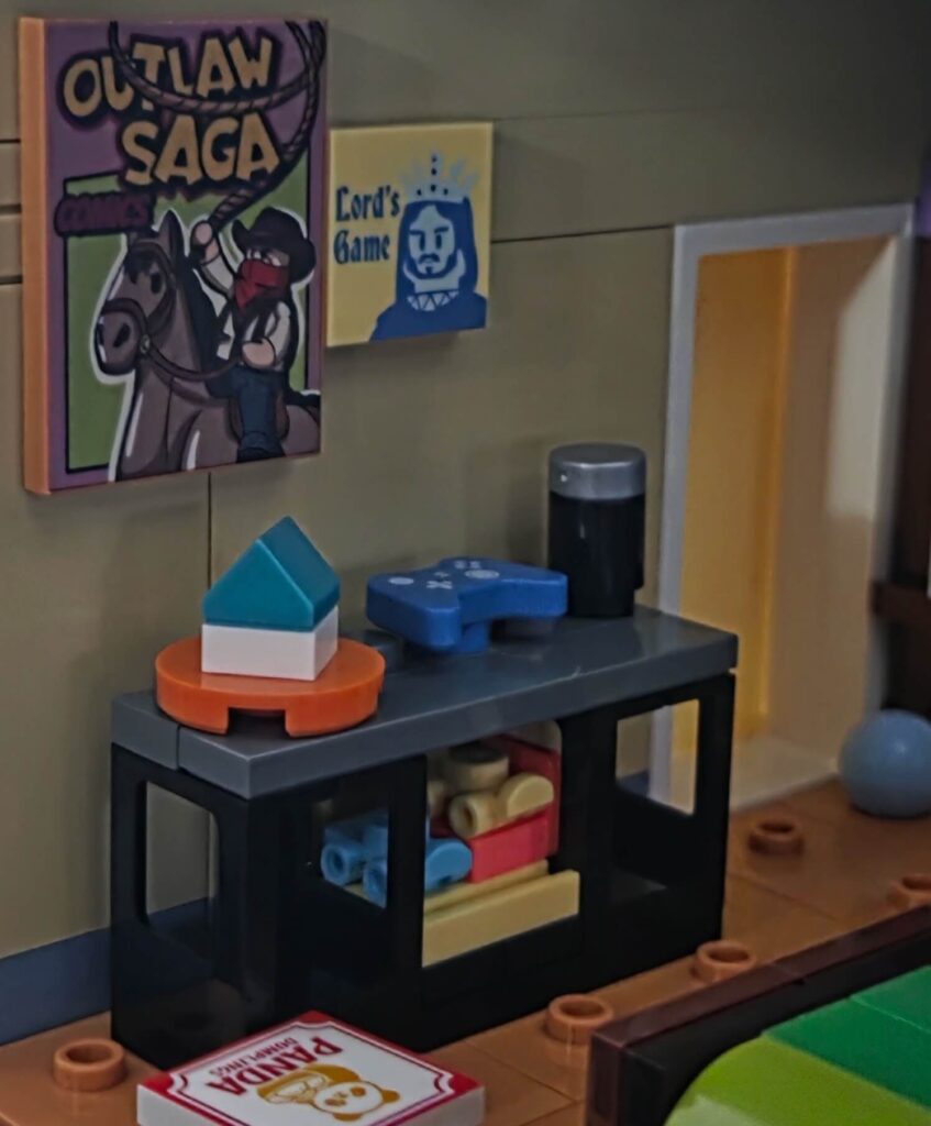 This is my favourite room in the build. The vibe here is spot on. From the yellow skateboard casually tossed upside down on the floor to the blue baseball cap with headphones resting on the bedside table, it tells a story. There is even a box of “Panda” takeout food just dumped on the wooden floorboards next to the bed!