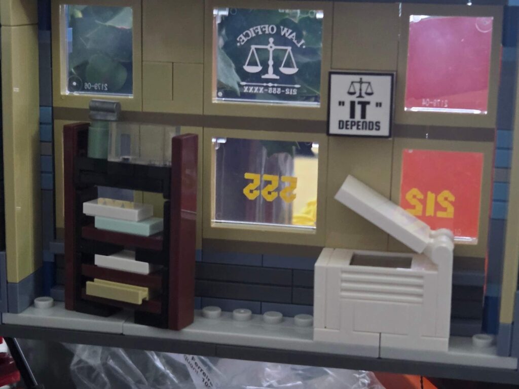 Finally, the window prints on this floor are exceptionally crisp. They feature the “Law Office” logo and the scales of justice designed to be read perfectly from the street outside. My absolute favourite touch, however, is the small printed sign on the interior wall that simply says “IT DEPENDS”. It is the ultimate classic lawyer joke, and it proves that the designers really injected a sense of fun into this build!