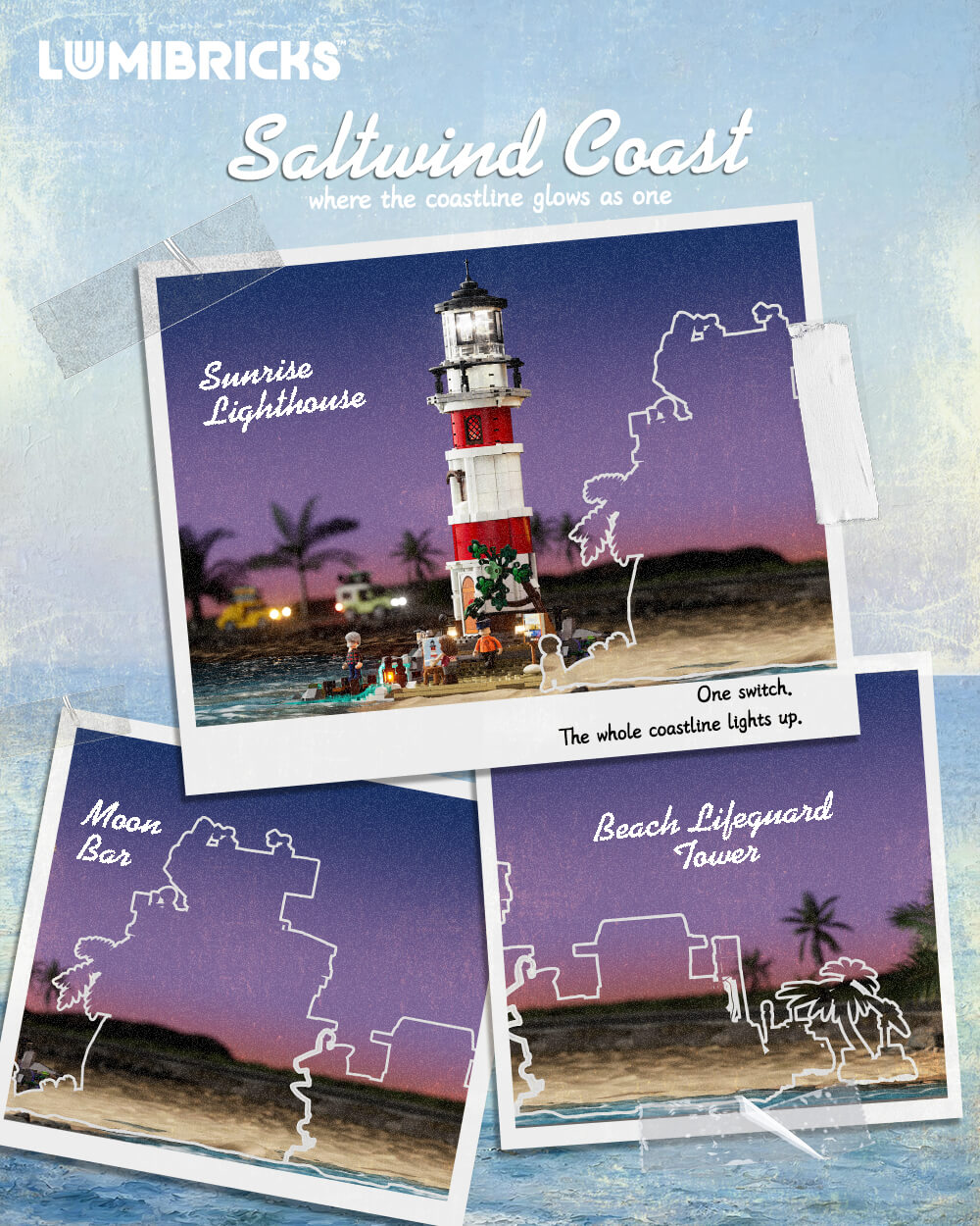 Lumibricks have dropped a new teaser poster for an upcoming theme called Saltwind Coast. Sunrise Lighthouse is front and centre, but the poster also shows silhouettes for two new sets: Moon Bar and Beach Lifeguard Tower. All three seem to be part of one connected coastline.