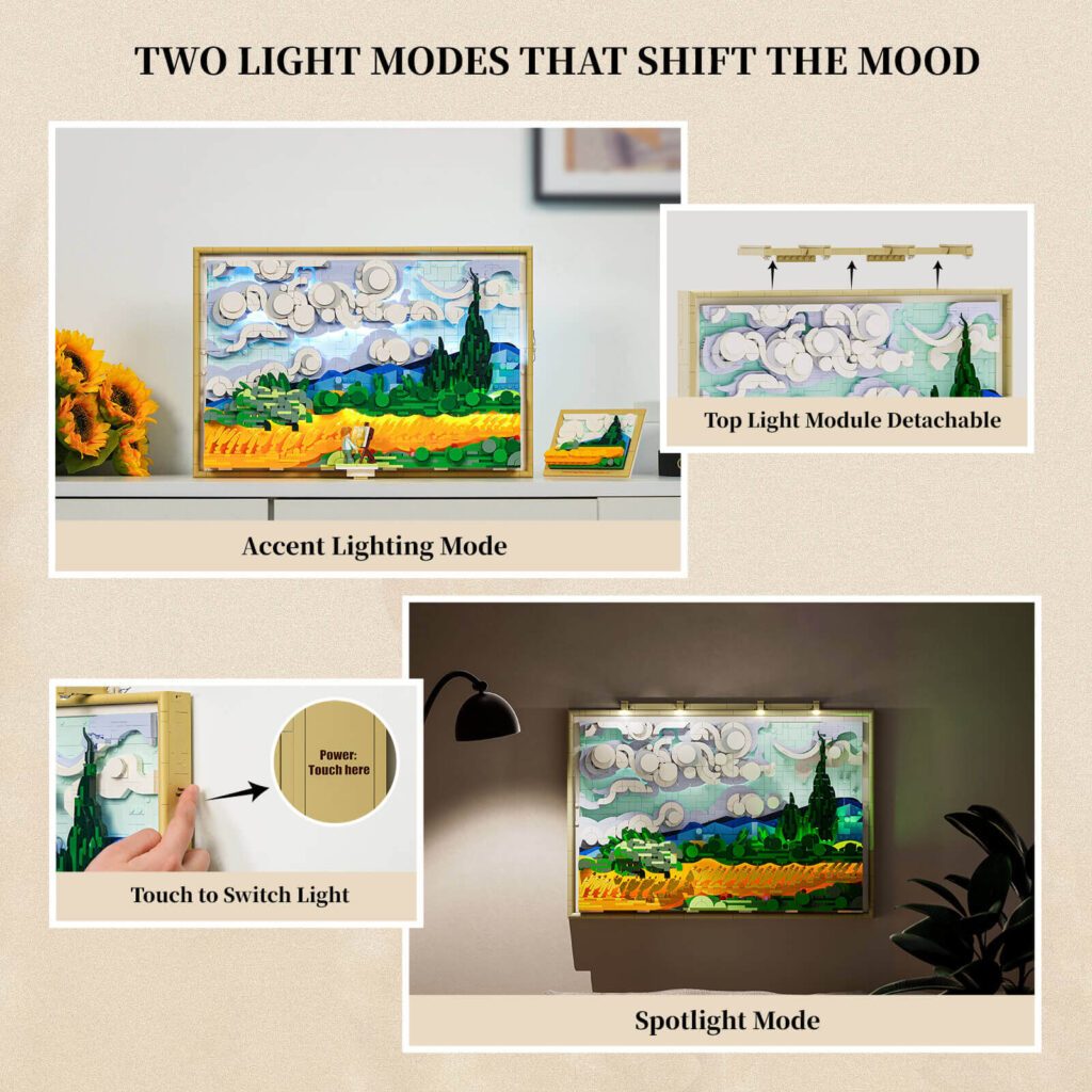 The absolute standout feature of this set is the integrated dual-mode lighting system. Van Gogh was deeply obsessed with capturing the changing light of the day, and Lumibricks has honoured that perfectly.