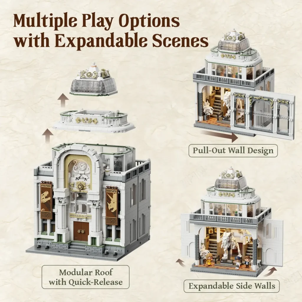 Visually, the exterior is very clean and smooth. Pantasy describes it as an “Elegant Ivory Palette”, and while the classic Roman columns and the large vintage dinosaur exhibition posters look great, the sheer amount of white and light grey might feel a little plain to some, especially when compared to highly decorative museum style builds from other brands.